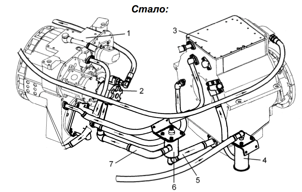 5, 7 – трасса всасывания насоса НШ 50А-3Л рабочей жидкости через магнитный фильтр из коробки передач;