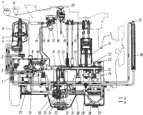 Отвернуть пробки сливных отверстий 27 и 33 (см. рис. 15), пробку 25 в верхней части масляного радиатора и слить масло в подготовленную емкость сразу после остановки прогретого дизеля. Промыть пробки и сапун дизельным топливом. После промывки смочить набивку сапуна маслом и стряхнуть излишки.