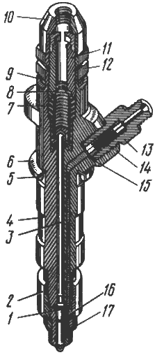 При плохом распыливании топлива форсунку разобрать, очистить детали от нагара и промыть. Отверстия в распылителе прочистить иглой. При разборке форсунки для снятия распылителя ослабить пружину 7, вывернув регулировочный винт 11, затем отвернуть гайку 2 распылителя. Если выполненные работы не повысят качество распыливания топлива, заменить распылитель. В случае замены распылителя, перед установкой форсунки в головку проверить биение цилиндрической поверхности распылителя относительно установочной поверхности форсунки. Распылитель должен быть установлен с радиальным биением не более 0,2 мм.