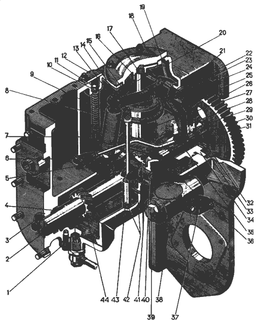 Поворачивать наружный рычаг регулятора в сторону вентилятора до тех пор, пока плечо рычага 5 не упрется в упор 7 минимальной подачи без деформации пружины упора.