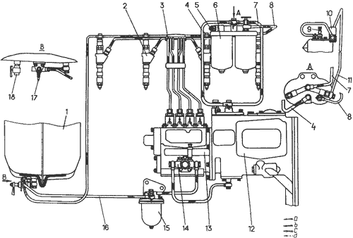 Отсоединить топливопроводы 3 (см. рис. 8) высокого давления от секций топливного насоса 13, трубку слива топлива из корпуса топливного насоса, топливопровод 11 подвода топлива к топливоподкачивающему насосу, трубки и топливопровод от топливоподкачивающего насоса, провод от датчика 6 давления топлива, тягу к регулятору.