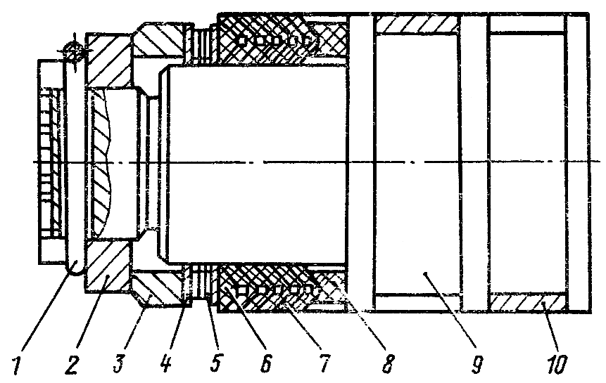 Трущиеся поверхности деталей при сборке смажьте солидолом. Наденьте на поршень 9 два кольца 10 так, чтобы разрезы колец были на противоположных сторонах. Наденьте на поршень детали уплотнения последовательно:нажимное кольцо 8, пять манжет 7 и опорное кольцо 6. Наденьте на поршень прокладку 4, два пружинных кольца 5, вторую прокладку 4 и проставку 3. Наверните от руки корончатую гайку 2, не затягивая ее.