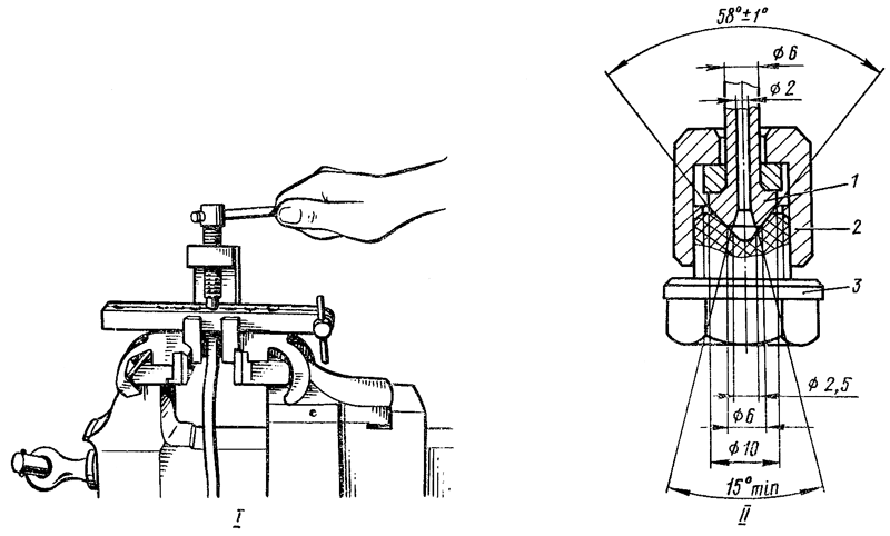 2. При значительном повреждении конусов топливопровода, вызывающем течь топлива, а также при сужении канала допускается отрезание конусной головки и высадка нового конуса ручным прессом.