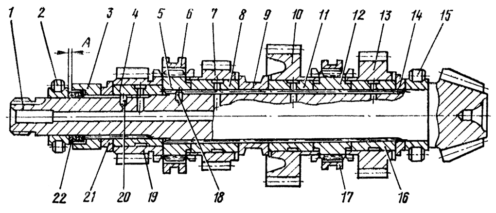 Установите хомут 12 подвода смазки с пружиной 11 на вал 1 лыской в сторону нижнего вала (для машин первого выпуска). Установите шестерню 13 привода масляного насоса, втулку 14 и втулку 19. Сдвиньте до упора шестерни и втулки и установите пакет регулировочных прокладок 18 так, чтобы обеспечить зазор А = 0,05...0,3 мм между втулкой 19 и роликоподшипником 15. Прокладки толщиной 2,0 мм установите с двух сторон пакета. Нагрейте роликоподшипник 15 и установите на вал. Наденьте стопорную шайбу 17., Собранный вал затяните гайкой 16. Момент затяжки гайки 450... 550 Н• м (45...55 кгс м). Отогните шайбу 17 на грань гайки. У собранного вала шестерни должны свободно вращаться на втулках, муфты должны перемещаться без заеданий.
