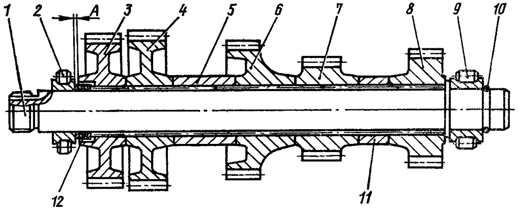 Сдвиньте до упора шестерни и втулки, установите пакет регулировочных прокладок 12, обеспечив зазор А = 0,05...0,3 мм между торцом шестерни 3 и торцом внутреннего кольца роликоподшипника 2. Прокладки толщиной 2,0 мм установите с двух сторон пакета. Нагрейте подшипник 2 и установите на вал.