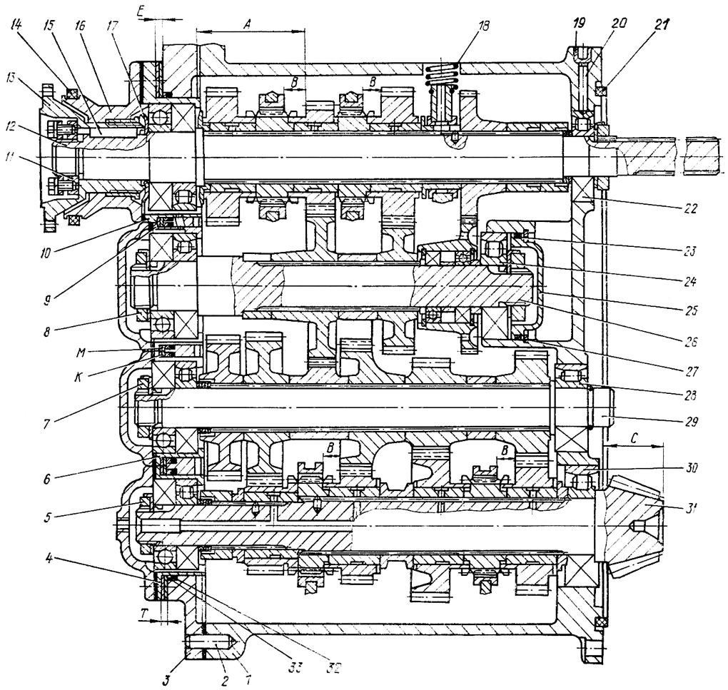 Закрепите крышку 3 на корпусе болтами с шайбами. Проверьте вручную вращение валов. Вращение валов должно быть свободным, без заеданий. Проверьте, есть ли зазоры в зацеплениях шестерен. Зацепление зубьев любой пары шестерен без зазора не допускается. Поверните КП в приспособлении и выставьте нижний вал 31 на размер С= (83,9±0,1) мм между торцом вала и плоскостью корпуса коробки передач с помощью разрезных прокладок Т, устанавливаемых под фланец корпуса 4. Размер замеряйте при сдвинутом вале во внутрь коробки передач. При неправильной установке конической шестерни возможно разрушение конической пары в эксплуатации.
