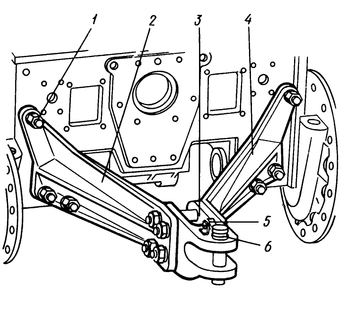 Это ограничение достигается с помощью цепей, один конец которых крепится к нижним тягам, а другой присоединен к проушинам опорных кронштейнов. Длину цепей можно изменять резьбовым регулировочным устройством.