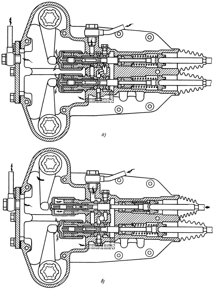 Вместе с ведущим валом коробки передач вращаются все шестерни масляного насоса; масло засасывается через маслоприемник 5 (см. рис. 75) из нижней части корпуса коробки передач. От насоса масло по трубе 9 (см. рис. 76) поступает к фильтру, если давление в трубе не превышает 500 кПа (5 кгс/см2). При давлении более указанного открывается предохранительный клапан 15 насоса (см. рис. 77). Подведенное к фильру масло очищается в нем (стрелка а, рис. 76) и очищенным поступает в трубу 36, идущую к радиатору. Если фильтрующие элементы засорены, открывается перепускной клапан фильтра и неочищенное масло поступает в трубопровод (стрелка б).
