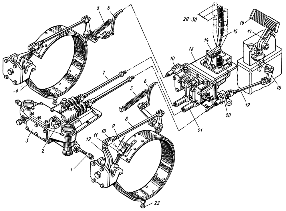 Чтобы уменьшить вибрацию труб при работе трактора, их закрепляют хомутами, подложив под хомуты резиновые прокладки. Хомуты крепятся к узлам трактора.