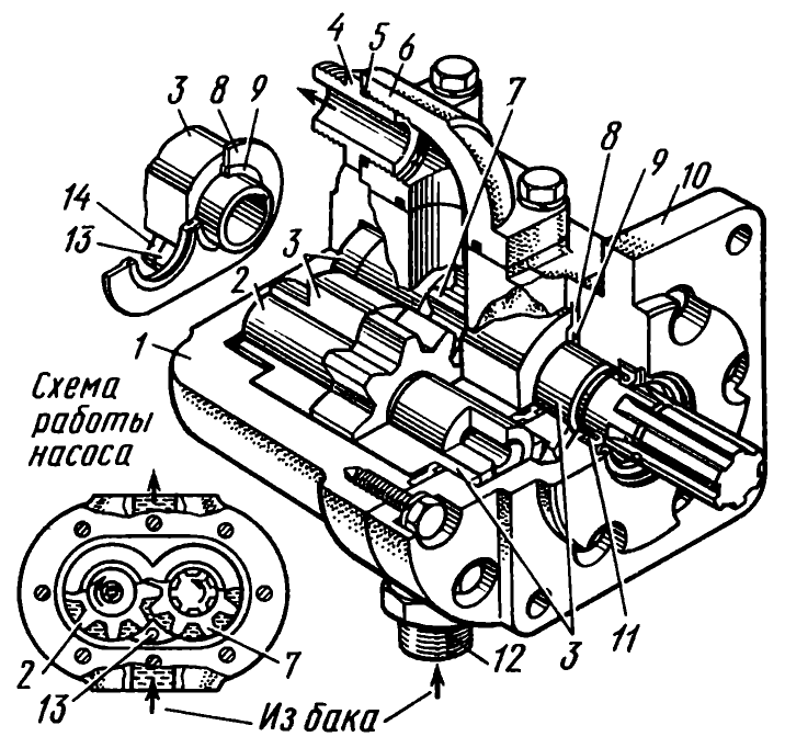 Устроен и работает насос следующим образом. При вращении ведущего вала коробки передач вращается шестерня 6 (см. рис. 77) вращая шестерни 7 и 10 (см. рис. 78) насоса. Масло засасывается через маслоприемник и под давлением поступает в смазочную систему. Шестерни насоса вращаются во втулках 6 и 9. Корпус насоса 2 закрыт крышками 1 и 4. Крышки и корпус стянуты болтами. Правильность установки обеспечивается штифтом 8.
