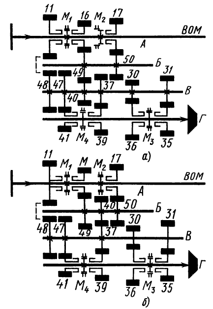 В холодное время года радиатор отключают от системы с помощью крана 41 «зима — лето», расположенного на левом лонжероне рамы трактора перед коробкой передач. Когда кран установлен в положение «зима» масло идет к точкам смазывания по малому кругу (стрелка в), минуя радиатор.